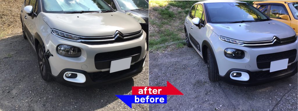 シトロエンC3のフロントバンパー交換等、板金修理を行いました